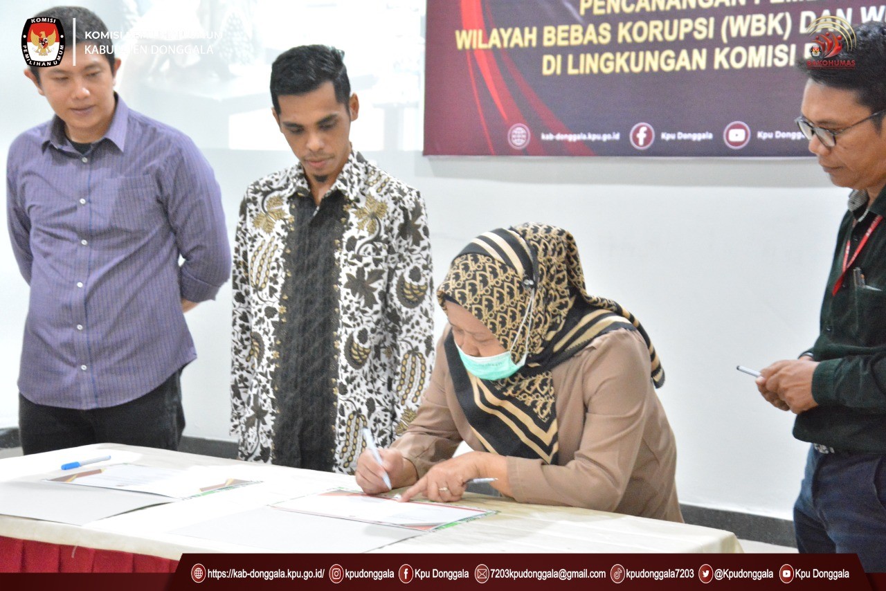 Pencanangan ditandai dengan penandatanganan Piagam Pencanangan Pembangunan Zona Integritas oleh Ketua KPU Donggala M. Unggul. Turut bertandatangan sebagai saksi Ketua Bawaslu Donggala Minhar, dan perwakilan Badan Kesbangpol Kabupaten Donggala Salma Kadir.