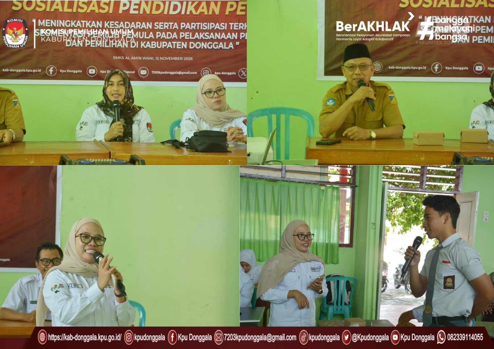 Sosialisasi secara resmi dibuka oleh Ketua KPU Kabupaten Donggala, Nurbia, dan mendapat sambutan hangat dari Kepala Sekolah SMKS Al-Amiin Wani, Tazkir Suleman. Dalam sambutannya, Nurbia menekankan pentingnya keterlibatan pemilih pemula sebagai penentu masa depan demokrasi Indonesia. Bertema “Meningkatkan Kesadaran serta Partisipasi terhadap Segmentasi Pemilih Pemula pada Pelaksanaan Pemilu dan Pemilihan di Kabupaten Donggala”, materi sosialisasi disampaikan oleh Ketua Divisi Sosialisasi, Pendidikan Pemilih, Partisipasi Masyarakat, dan SDM KPU Kabupaten Donggala, Mizul Rahyunita. Ia menjelaskan secara interaktif mengenai hak pilih, sistem pemilu, serta pentingnya menggunakan hak suara secara cerdas dan bertanggung jawab.