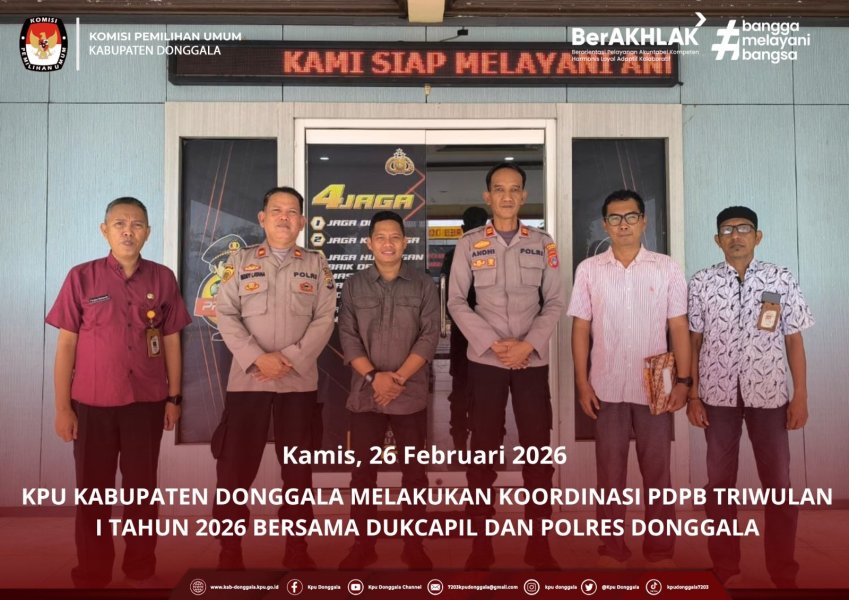 Donggala, 26 Februari 2026 – Komisi Pemilihan Umum (KPU) Kabupaten Donggala menggelar koordinasi terkait Pemutakhiran Data Pemilih Berkelanjutan (PDPB) Triwulan I Tahun 2026, Kamis (25/2/2026). Kegiatan ini dilaksanakan melalui kunjungan kerja ke Dinas Kependudukan dan Pencatatan Sipil (Disdukcapil) Kabupaten Donggala serta Polres Donggala.