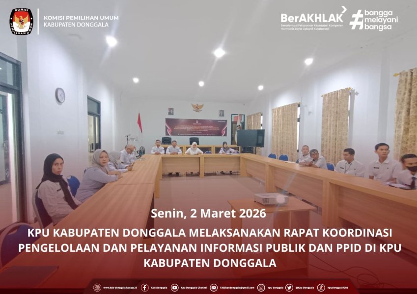 Donggala, 02 Maret 2026 – Komisi Pemilihan Umum (KPU) Kabupaten Donggala melaksanakan Rapat Koordinasi Pengelolaan dan Pelayanan Informasi Publik serta Pejabat Pengelola Informasi dan Dokumentasi (PPID), dalam rangka memperkuat komitmen kelembagaan terhadap prinsip keterbukaan informasi publik.