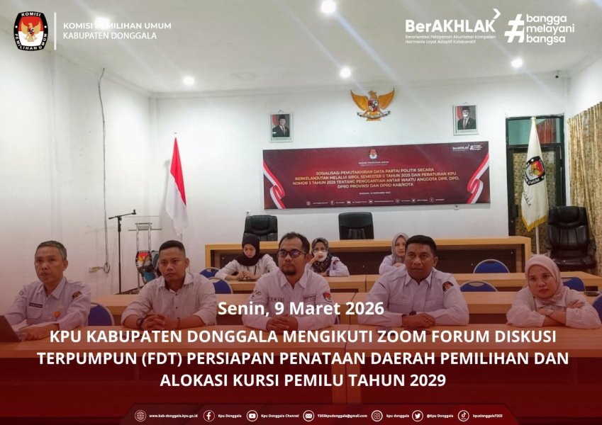 Donggala, 9 Maret 2026 – Komisi Pemilihan Umum (KPU) Kabupaten Donggala mengikuti kegiatan Zoom Forum Diskusi Terpumpun (FDT) dalam rangka persiapan awal penataan daerah pemilihan (Dapil) dan alokasi kursi untuk Pemilihan Umum (Pemilu) tahun 2029.