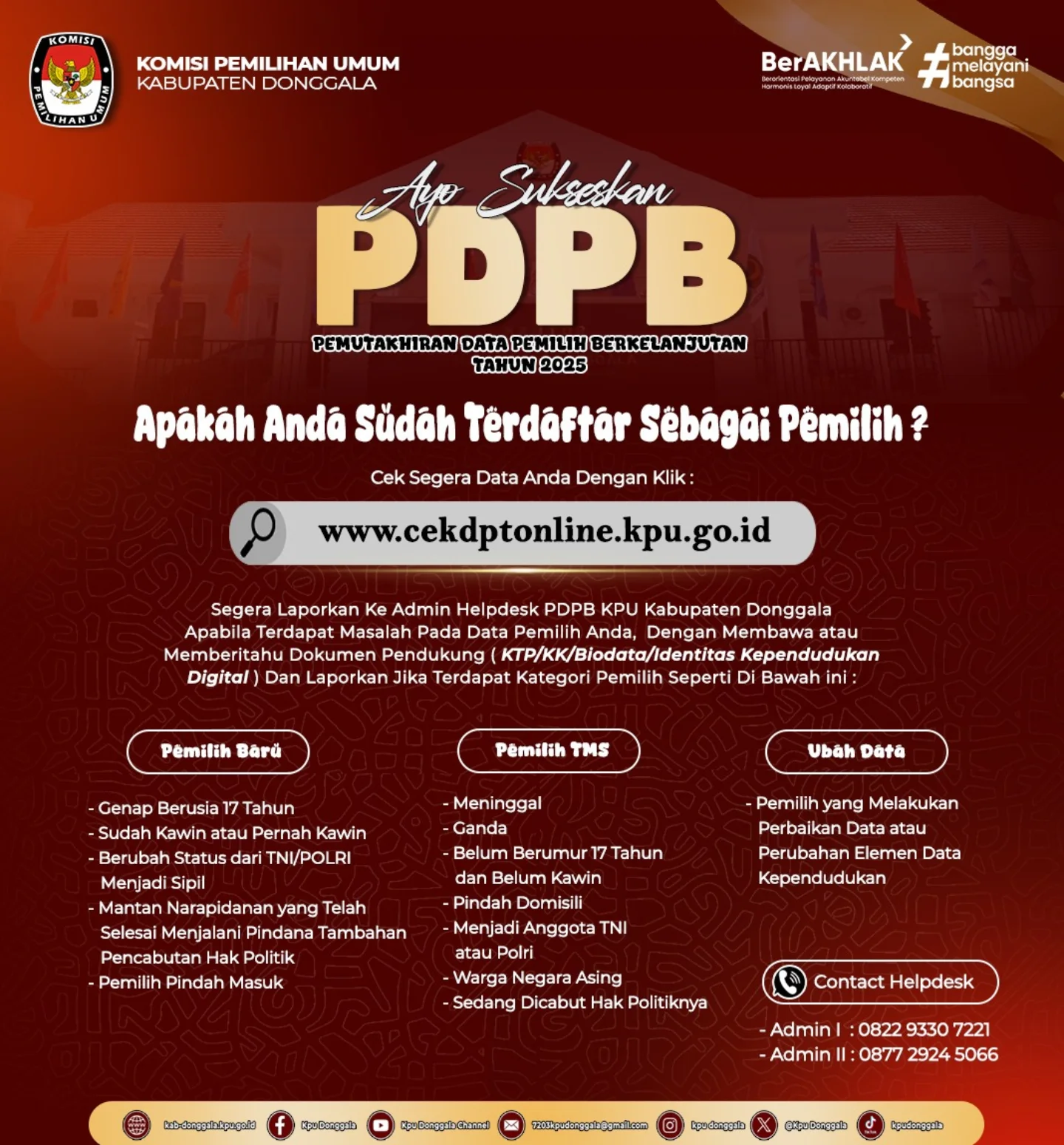 Dalam sosialisasi tersebut, KPU Kabupaten Donggala mengimbau seluruh masyarakat untuk secara proaktif melakukan pengecekan status kepesertaan pemilih melalui laman resmi cekdptonline.kpu.go.id. Langkah ini penting untuk memastikan nama warga telah terdaftar secara valid dalam Daftar Pemilih.
