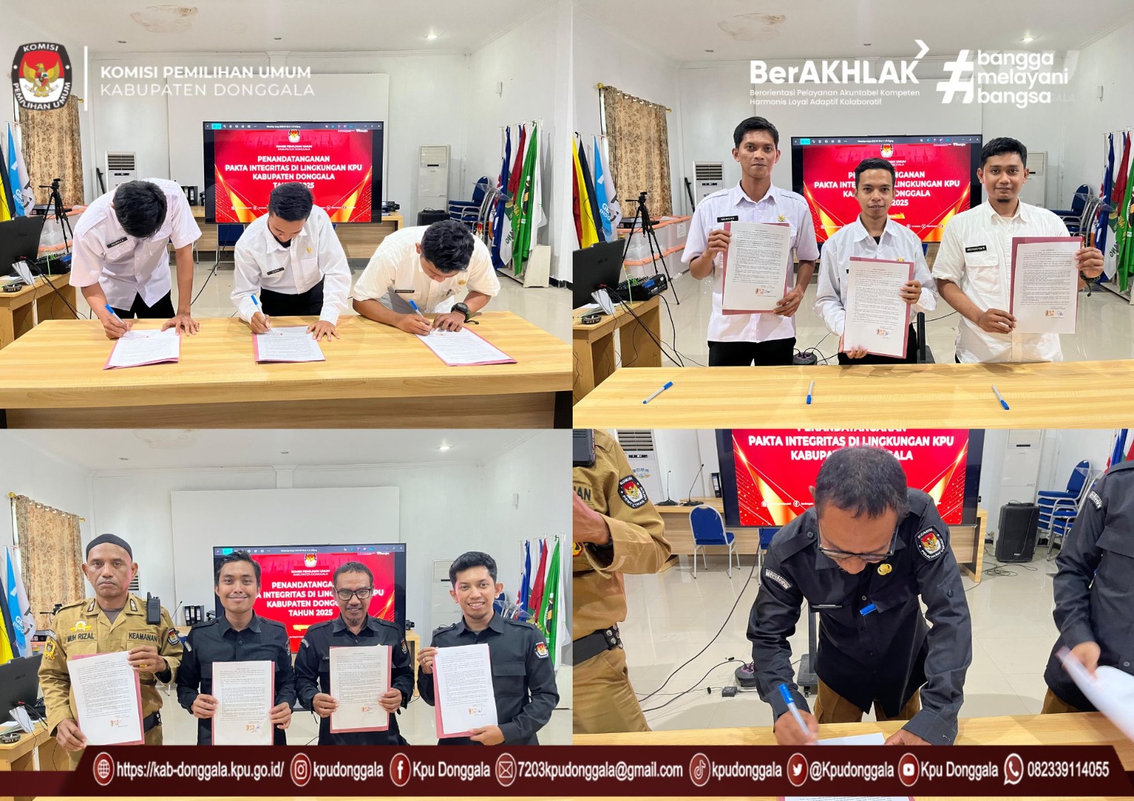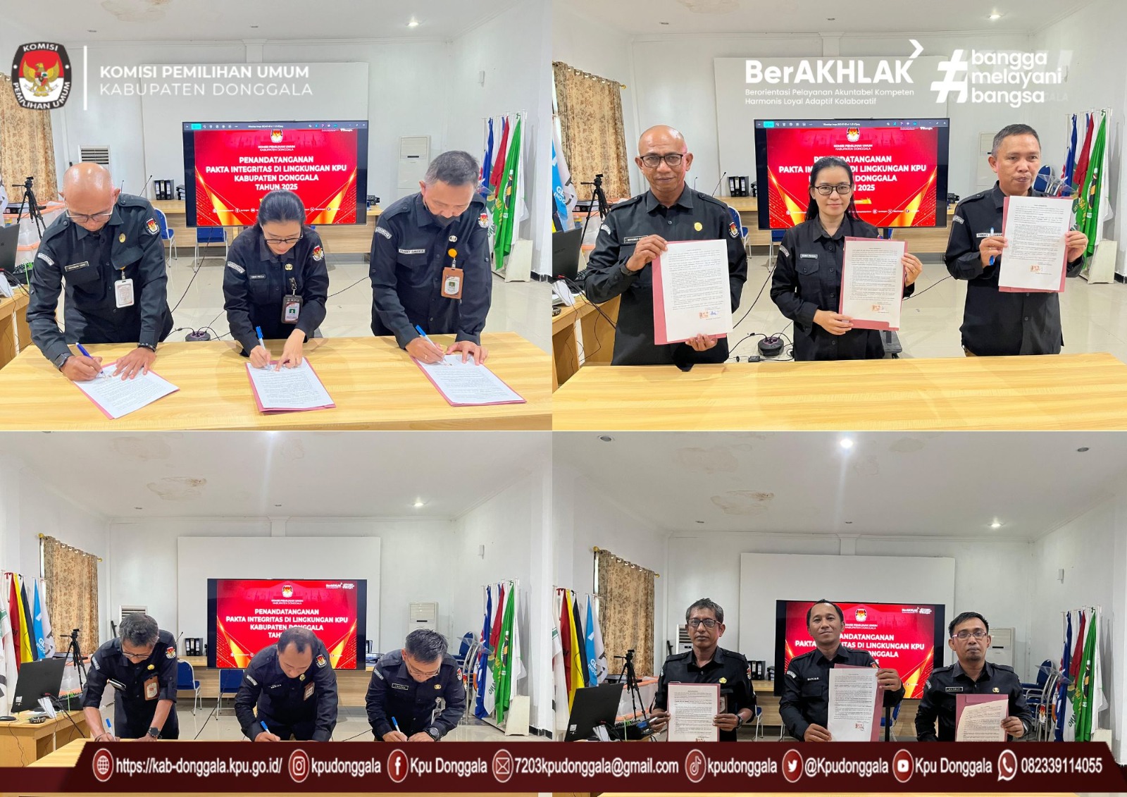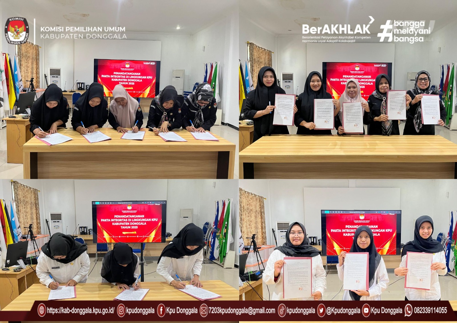 Rabu, 30 Juli 2025 – Seluruh jajaran Komisi Pemilihan Umum (KPU) Kabupaten Donggala menggelar penandatanganan Pakta Integritas di lingkungan KPU. Acara ini dihadiri oleh Ketua dan Anggota KPU Kabupaten Donggala, serta seluruh Pegawai Negeri Sipil (PNS), Calon Pegawai Negeri Sipil (CPNS), Pegawai Pemerintah dengan Perjanjian Kerja (PPPK), dan Pegawai Pemerintah Non Pegawai Negeri (PPNP) sekretariat KPU Kabupaten Donggala.
