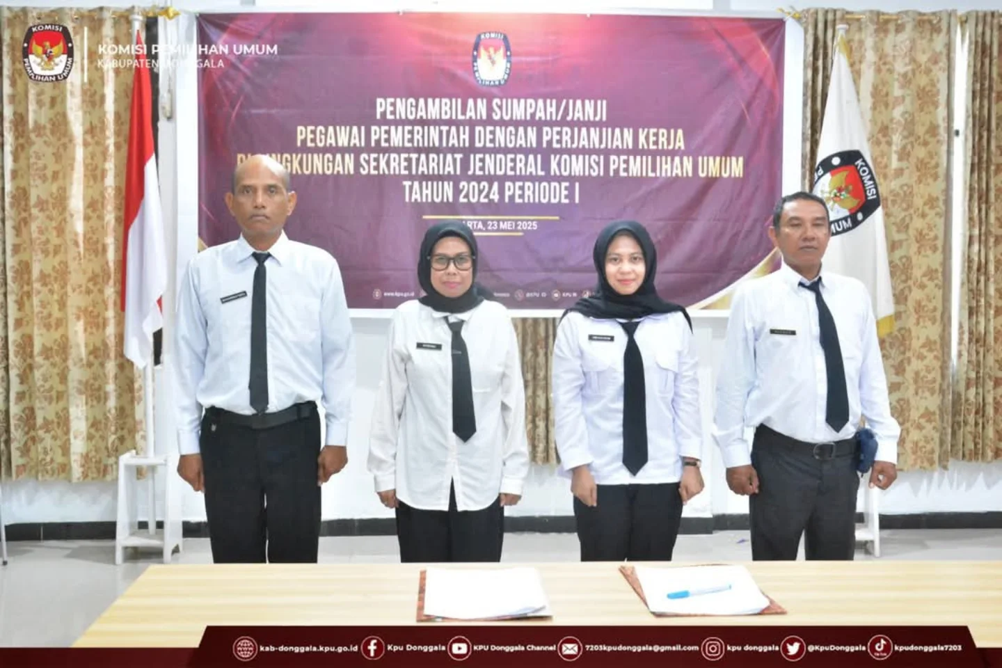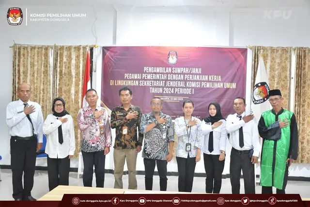 Jumat, 23 Mei 2025 - Komisi Pemilihan Umum (KPU) Kabupaten Donggala melaksanakan kegiatan Pembekalan dan Pengambilan Sumpah/Janji Pegawai Pemerintah dengan Perjanjian Kerja (PPPK) di Lingkungan Sekretariat Jenderal Komisi Pemilihan Umum Tahun 2024 Periode I, Kegiatan ini berlangsung di Ruang Rapat KPU Kabupaten Donggala. Jumat, 23 Mei 2025 yang dilaksanakan secara daring yang diawali dengan kegiatan pembekalan yang dibawakan langsung oleh Kepala Biro Sumber Daya Manusia Sekretariat Jenderal KPU RI, Ibu Yuli hertaty. Dalam arahannya, beliau menyampaikan komitmen KPU RI untuk mengangkat tenaga PPNPN yang telah lama mengabdi di lingkungan KPU di seluruh Indonesia.