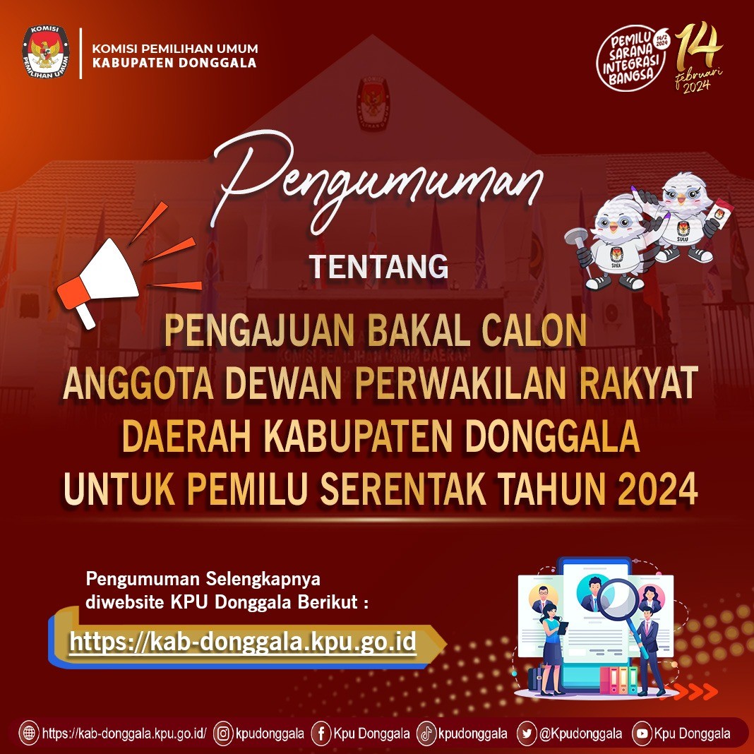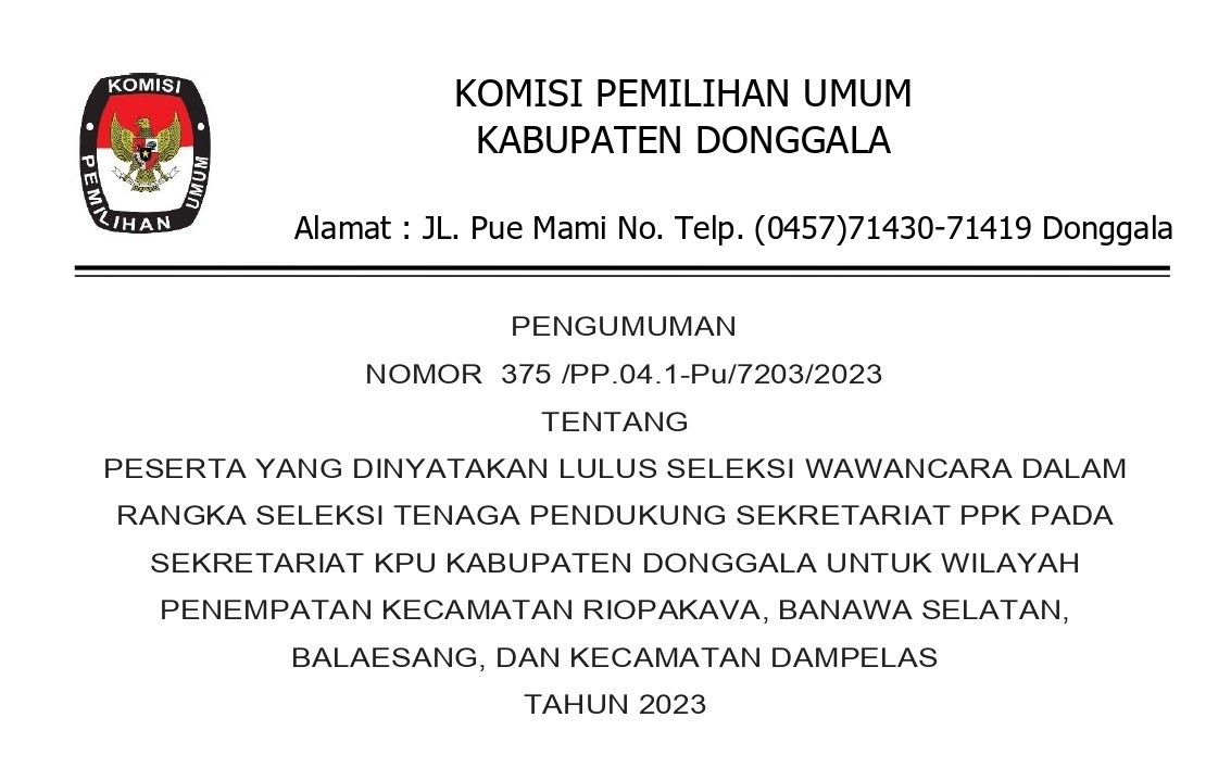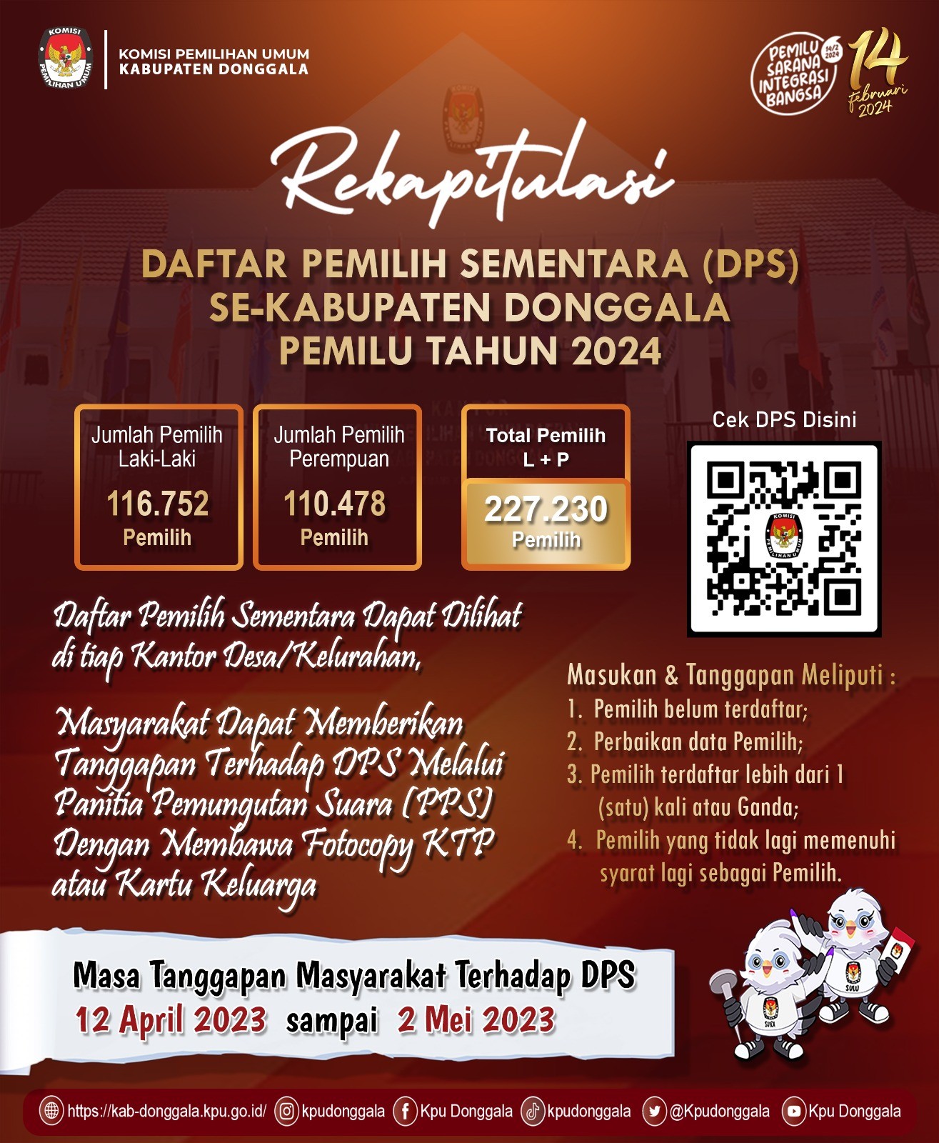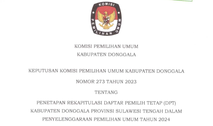 Berikut diumumkan Daftar Pemilih Sementara Kabupaten Donggala dalam Pemilu 2024 sesuai ketentuan Pasal 65 ayat (2) PKPU No. 7 Tahun 2022 Tentang Penyusunan Daftar Pemilih Dalam Penyelenggaraan Pemilihan Umum dan Sistem Informasi Data Pemilih sebagaimana telah diubah dengan PKPU No. 7 Tahun 2023 Tentang Perubahan Atas Peraturan Komisi Pemilihan Umum Nomor 7 Tahun 2022 Tentang Penyusunan Daftar Pemilih Dalam Penyelenggaraan Pemilihan Umum dan Sistem Informasi Data Pemilih.