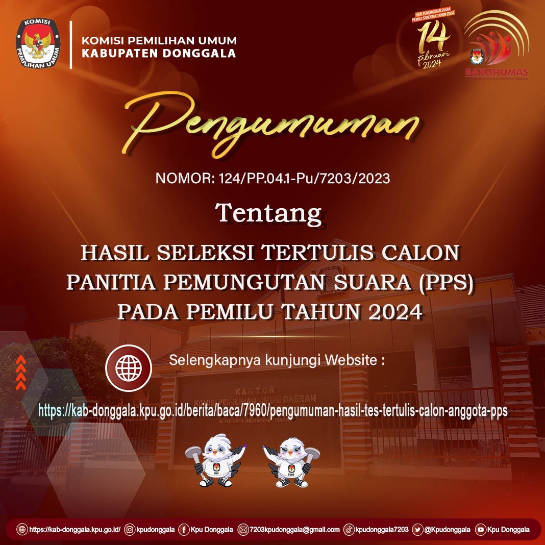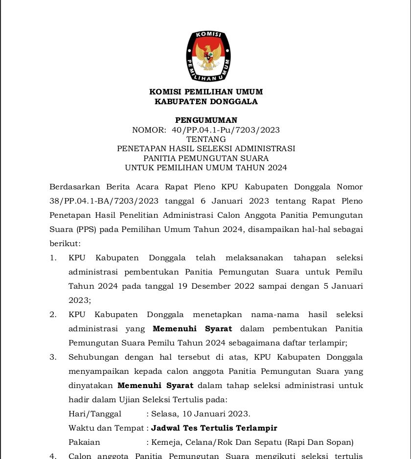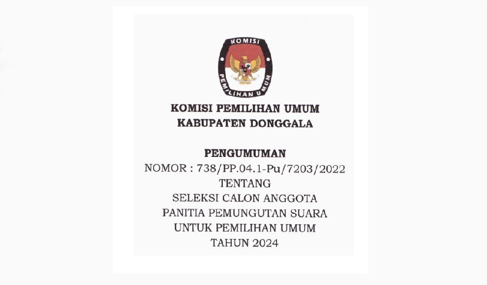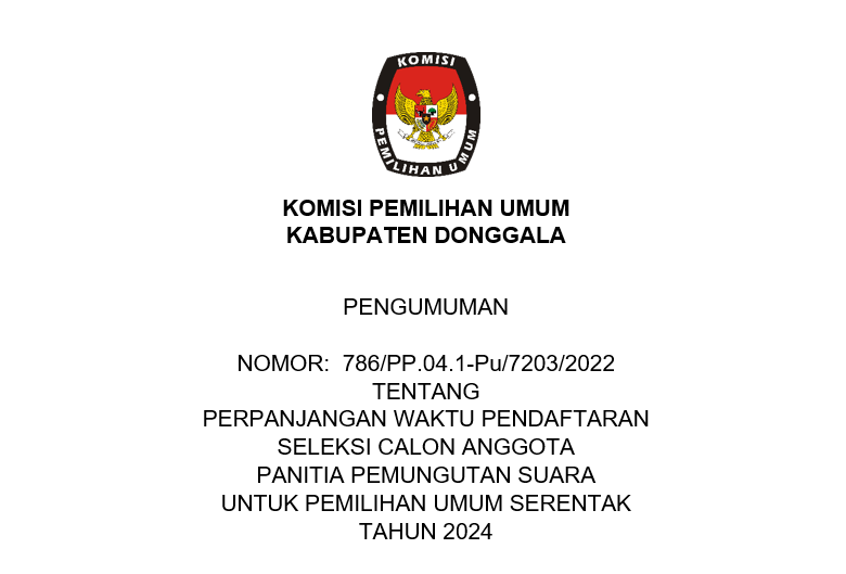 Sehubungan dengan terbitnya Keputusan Komisi Pemilihan Umum Nomor 534 Tahun 2022 tentang Perubahan atas Keputusan Komisi Pemilihan Umum Nomor 476 Tahun 2022 tentang Pedoman Teknis Pembentukan Badan Adhoc Penyelenggara Pemilihan Umum dan Pemilihan Gubernur dan Wakil Gubernur, Bupati dan Wakil Bupati, dan Walikota dan Wakil Walikota yang mengatur mengenai perubahan jadwal pembentukan PPS di dalamnya, dengan ini KPU Kabupaten Donggala menyampaikan Pengumuman NOMOR : 754/PP.04.1-Pu/7203/2022 TENTANG PERUBAHAN JADWAL PENDAFTARAN PANITIA PEMUNGUTAN SUARA UNTUK PEMILIHAN UMUM TAHUN 2024.
