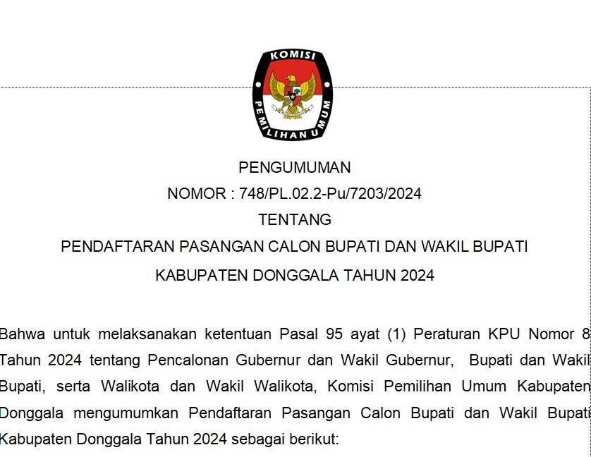 Berdasarkan ketentuan PKPU No. 13 Tentang Kampanye Pemilihan Gubernur Dan Wakil Gubernur, Bupati Dan Wakil Bupati, Serta Walikota Dan Wakil Walikota pada Pasal 8 "KPU Provinsi dan KPU Kabupaten/Kota mengumumkan nama tim Kampanye dan petugas penghubung Pasangan Calon sesuai dengan tingkatannya yang telah didaftarkan sebagaimana dimaksud dalam Pasal 7 ayat (3) pada papan pengumuman dan/atau laman KPU Provinsi dan KPU Kabupaten/Kota". Berikut diumumkan Susunan Tim Kampanye Paslon Bupati dan Wakil Bupati Kabupaten Donggala pada Pilkada Serentak Tahun 2024
