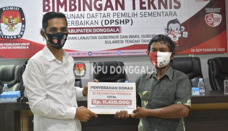 Komisi Pemilihan Umum (KPU) Kabupaten Donggala menyerahkan bantuan Donasi kepada penyelenggara Badan Adhoc PPK dan PPS terdampak banjir bandang yang terjadi di Kecamatan Pinembani. Penyerahan bantuan tersebut di serahkan langsung Ketua KPU Donggala, M. Unggul, kepada Saul anggota PPK Pinembani pada senin (28/9/2020) bertempat di aula Kantor KPU Donggala di sela kegiatan Bimtek Penyusunan Daftar Pemilih Sementara Hasil Perbaikan (DPSHP). M. Unggul menyampaikan bahwa bantuan ini merupakan hasil dari penggalangan donasi yang telah dilakukan mulai dari tanggal 16-27 September 2020 oleh KPU Donggala, PPK, PPS dan seluruh pihak penyelenggara se Kabupaten Donggala. “Langkah-langkah seperti ini sangat baik untuk membangun solidaritas dan memperkuat silaturahmi. Sesama penyelenggara harus berempati” ujarnya. Sebagai penerima Donasi, Saul menyampaikan ucapan terimakasih kepada para Donatur dan seluruh pihak penyumbang. “Saya mengucapkan banyak terimakasih atas perhatian dan bantuan bapak, Ibu serta saudara dan saya tidak bisa membalas dengan apa-apa tetapi saya hanya menyerahkan kepada Yang Maha Kuasa karena hikmatNya kita diberkatiNya” tutur Saul. Dalam kesempatan tersebut M. Unggul juga mengucapkan terima kasih kepada seluruh pihak Donatur yang telah menyumbang, meringankan beban korban terdampak Bencana. “Kepada teman PPK, PPS dan seluruh pihak yang sudah berpartisipasi kami ucapkan banyak terima kasih, Semoga budaya seperti ini terjaga dan terbangun selalu” tutupnya.